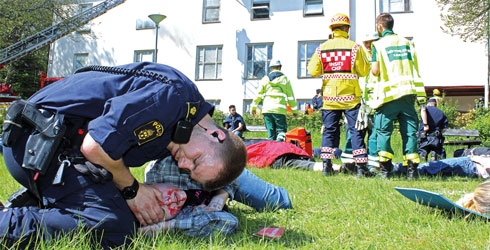 Bildtext: Polismannen Göran Jeverud tar hand om en skottskadad tjej medan brandmän och ambulanspersonal jobbar med att rädda andra elever efter den fingerade skolmassakern i Klockbackaskolan Stockholm.